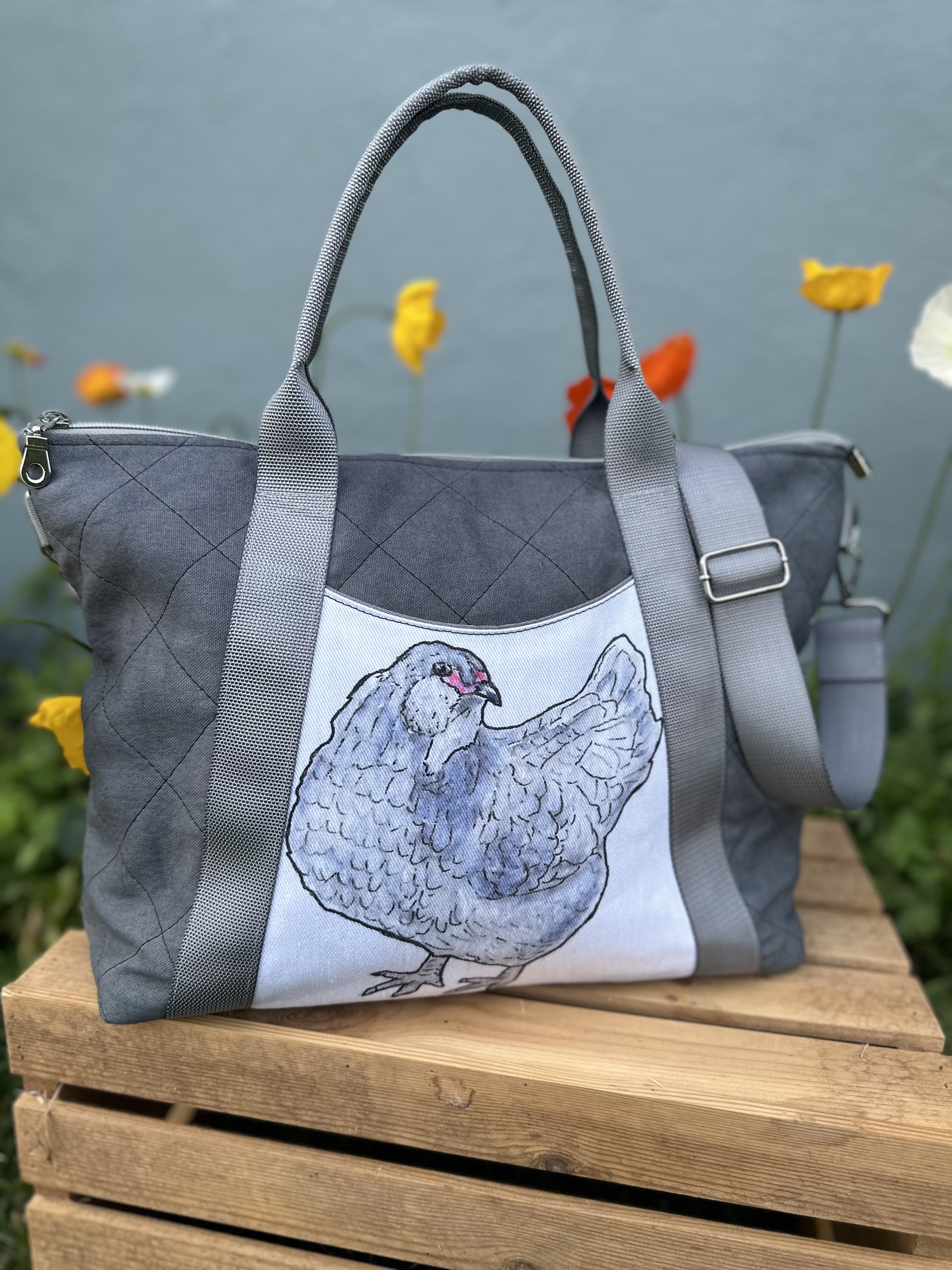 This handmade tote-style bag features a quilted grey canvas outer, with an adorable tuft-cheeked lavender Americauna chicken hen on the front slip pocket. The back slip pocket and lining are made from waterproof canvas. This spacious bag is “choock”-full of pockets to keep your stuff organized! In addition to the two outside slip pockets, the inside has a large slip pocket with a magnetic snap closure, a large zipper pocket, and two more smaller slip pockets. It can be used as an oversized handbag or shoulder bag, a work bag, knitting or crochet project keeper-the possibilities are endless!