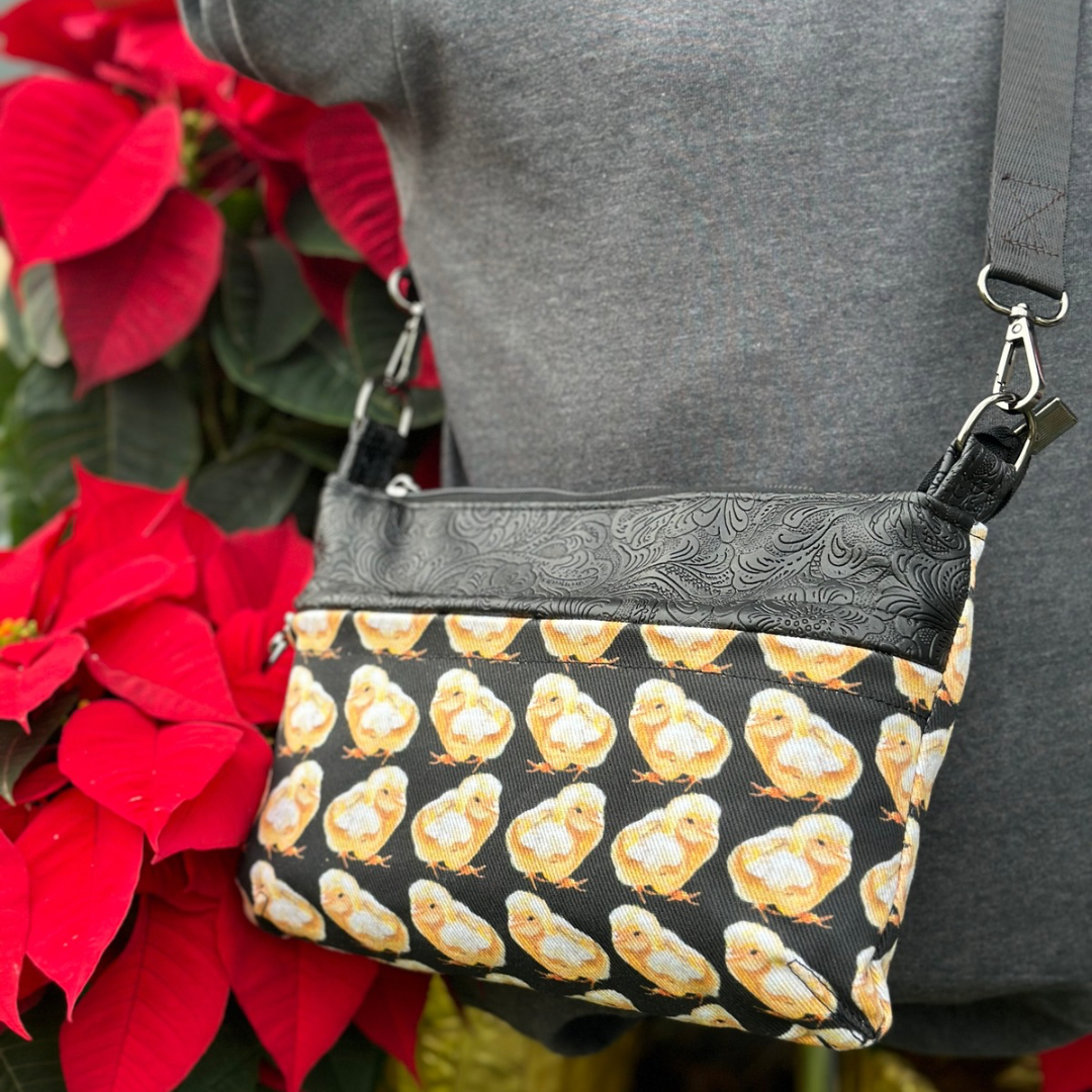 Cheery yellow chicks on black denim are complemented by black embossed faux leather, black zipper, and 1” seatbelt nylon strap with gunmetal hardware. The inside is made with Luxe Nylon for a rich feel that is easy to clean.