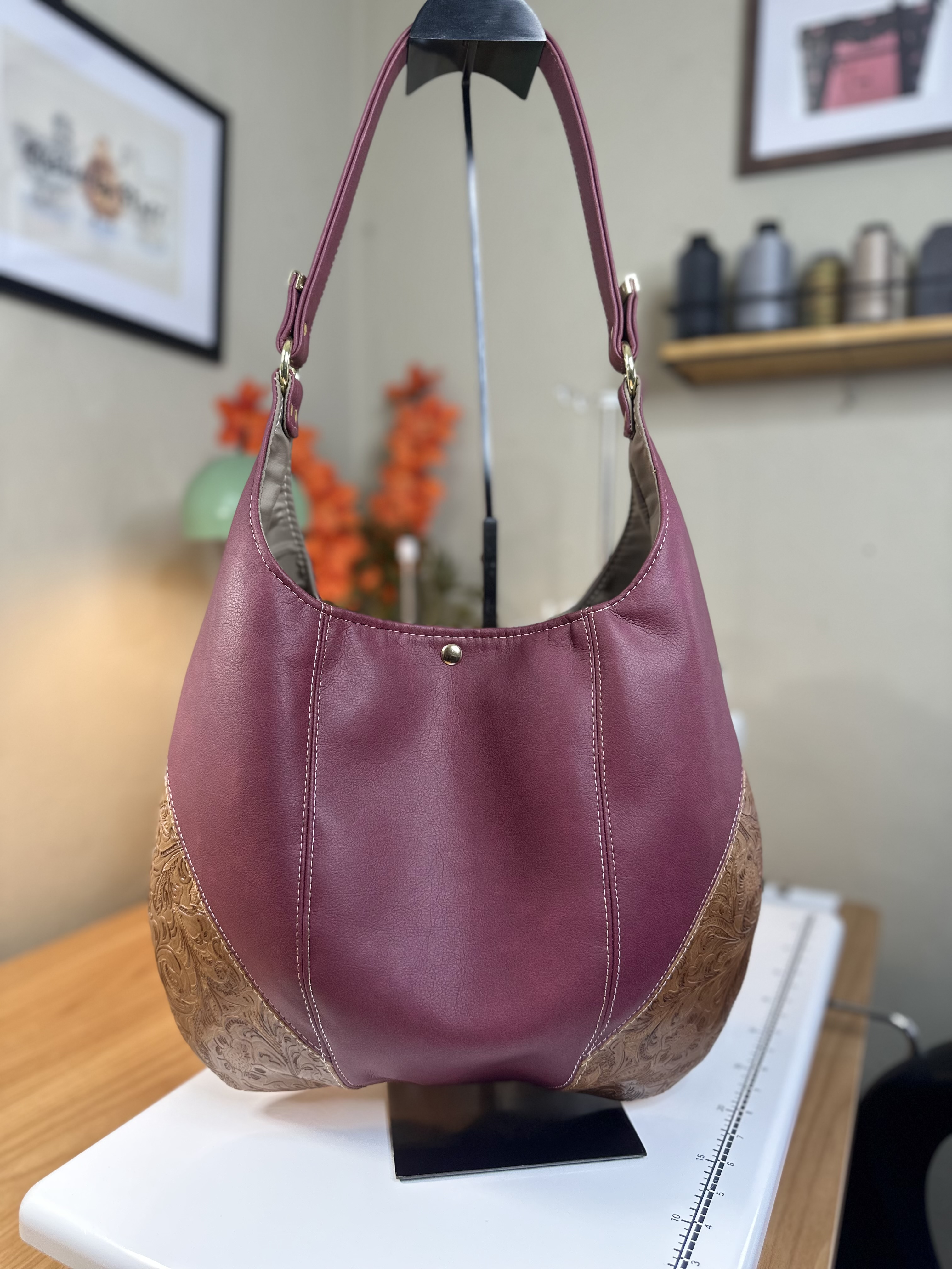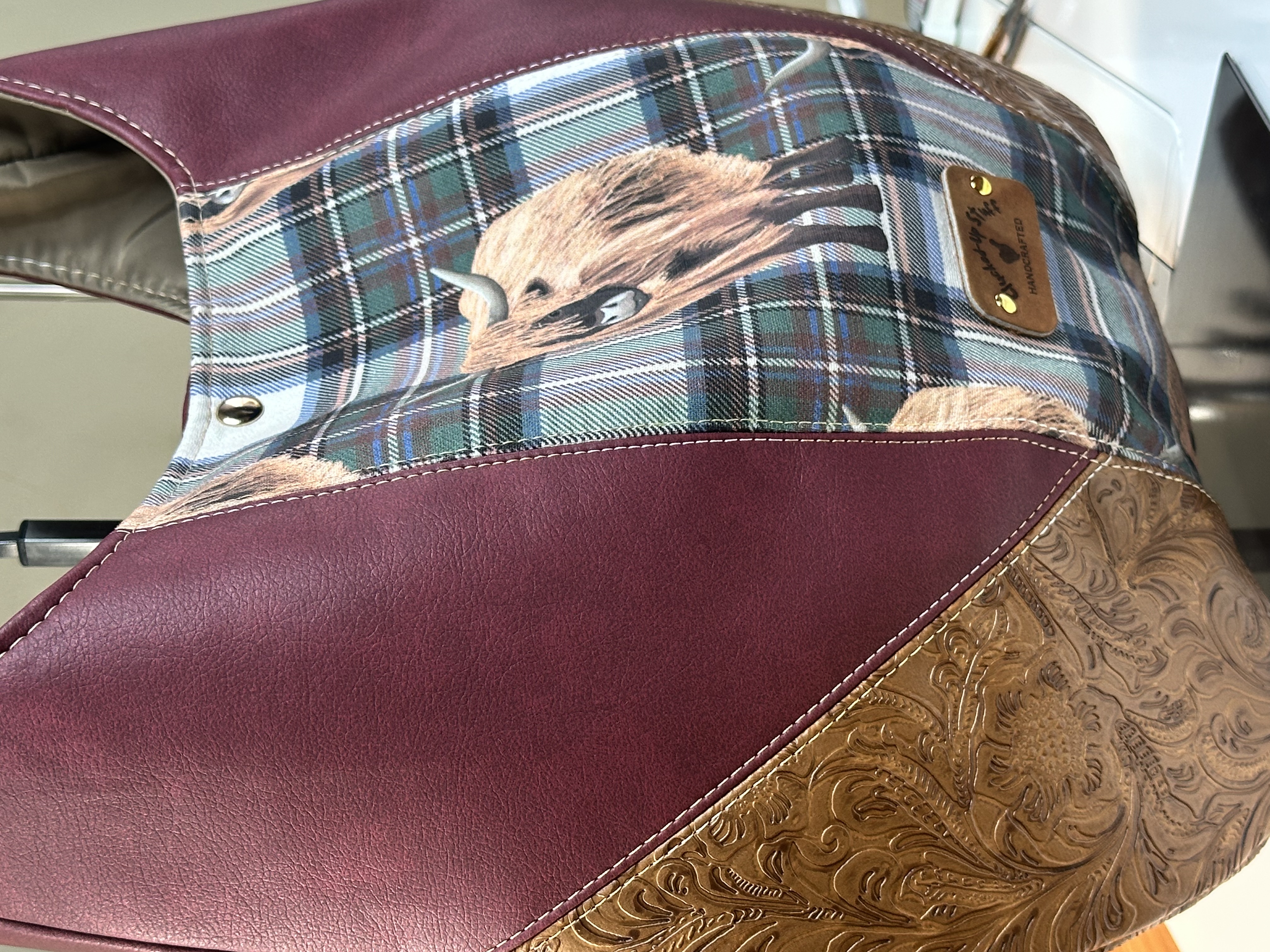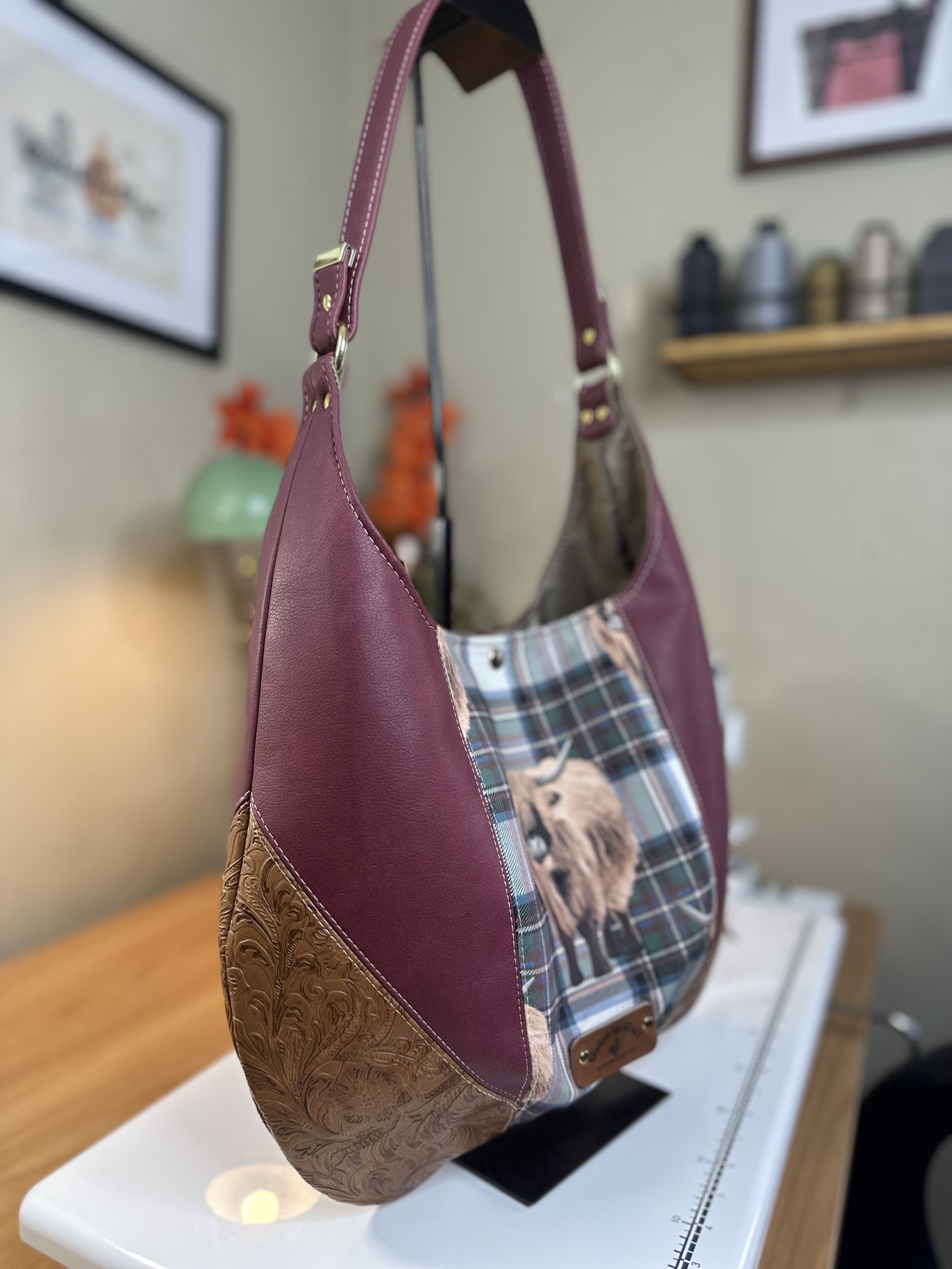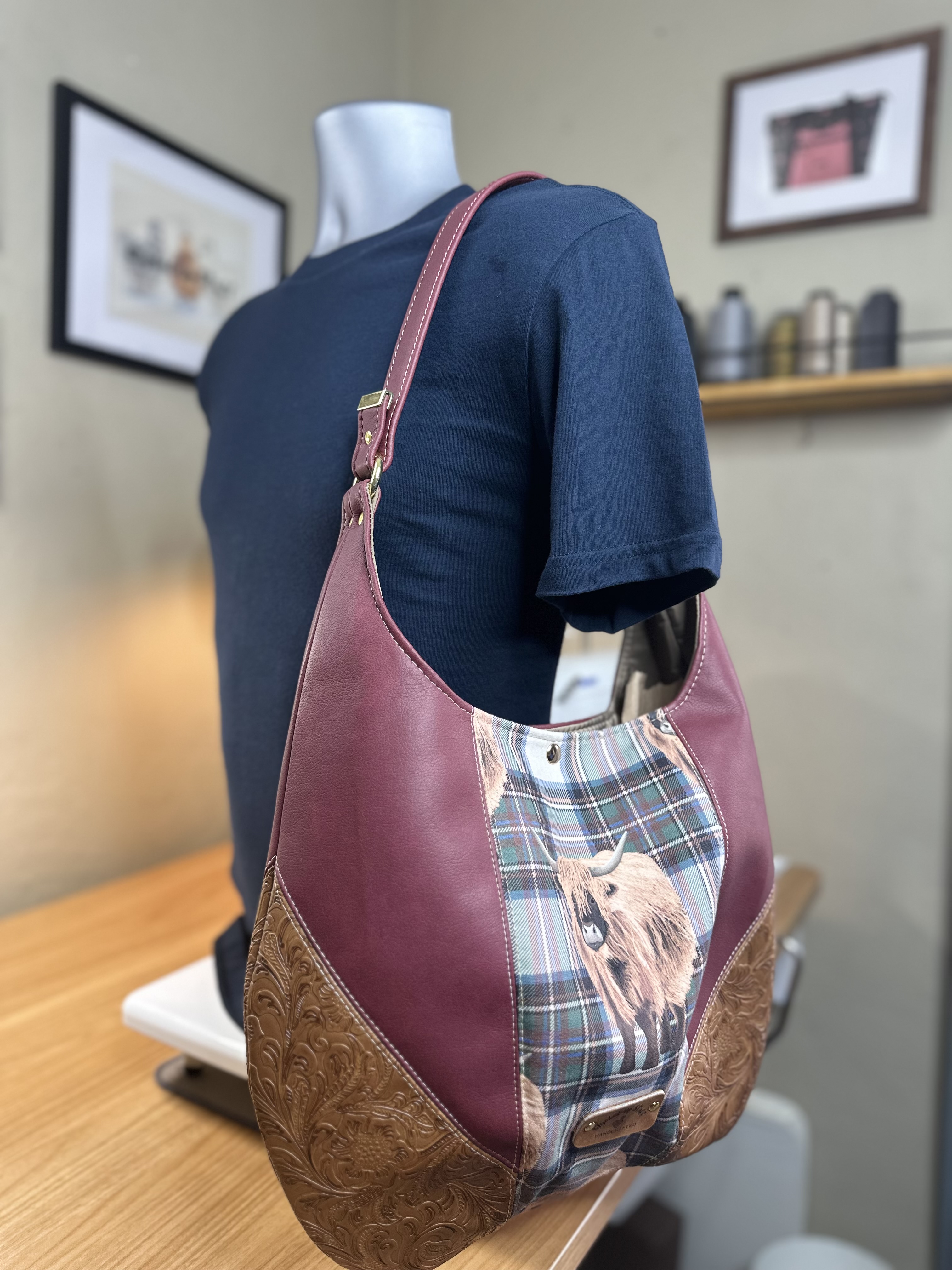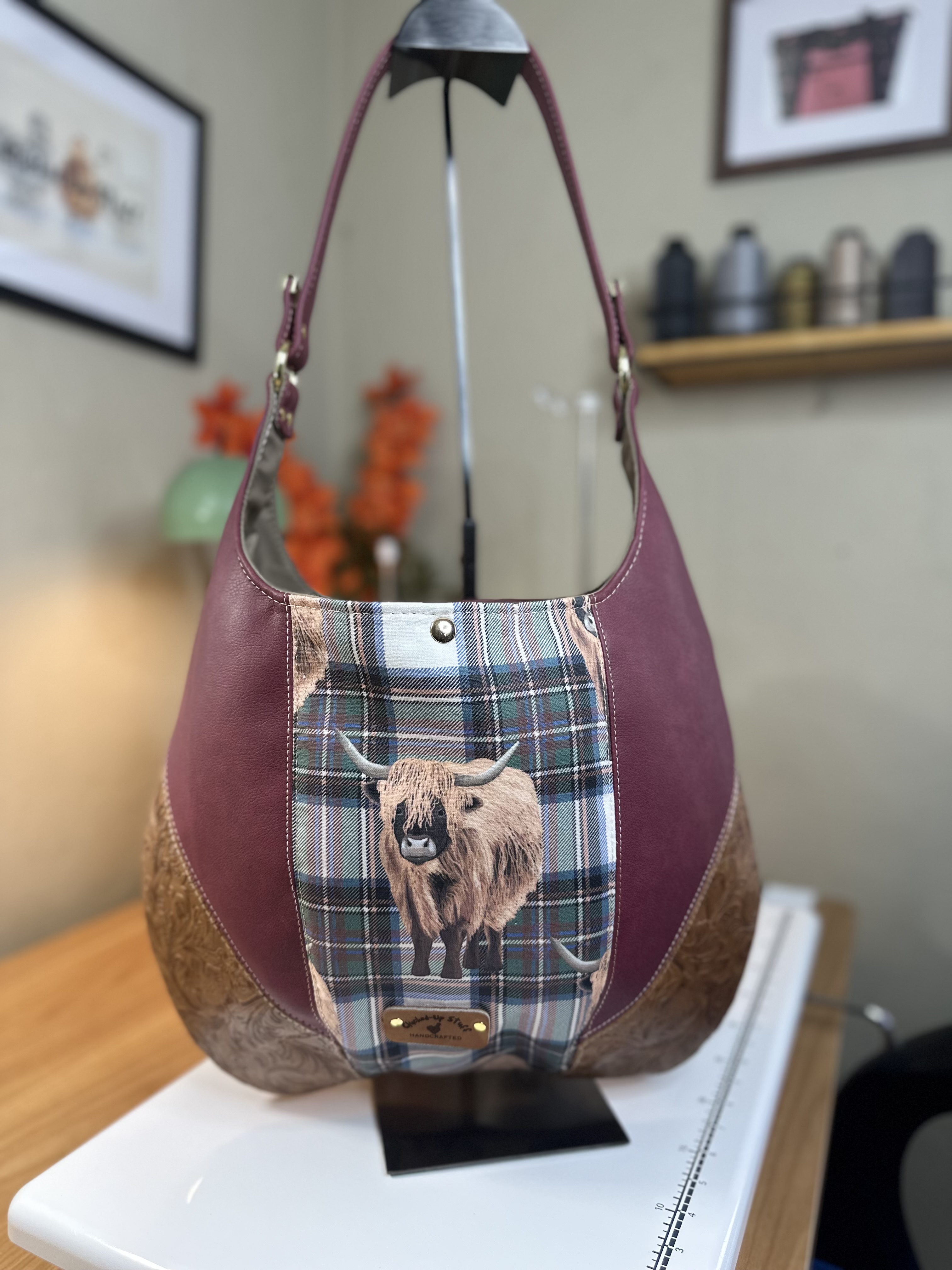 This slouchy, boho-inspired shoulder bag blends rustic charm with elevated craftsmanship. The exterior is made from buttery soft faux leather in a rich wine tone, complemented by embossed faux leather accents that add depth and texture. The standout feature is the Highland cow panel, crafted from Essex linen and framed with a plaid backdrop—bringing countryside elegance to your everyday carry.