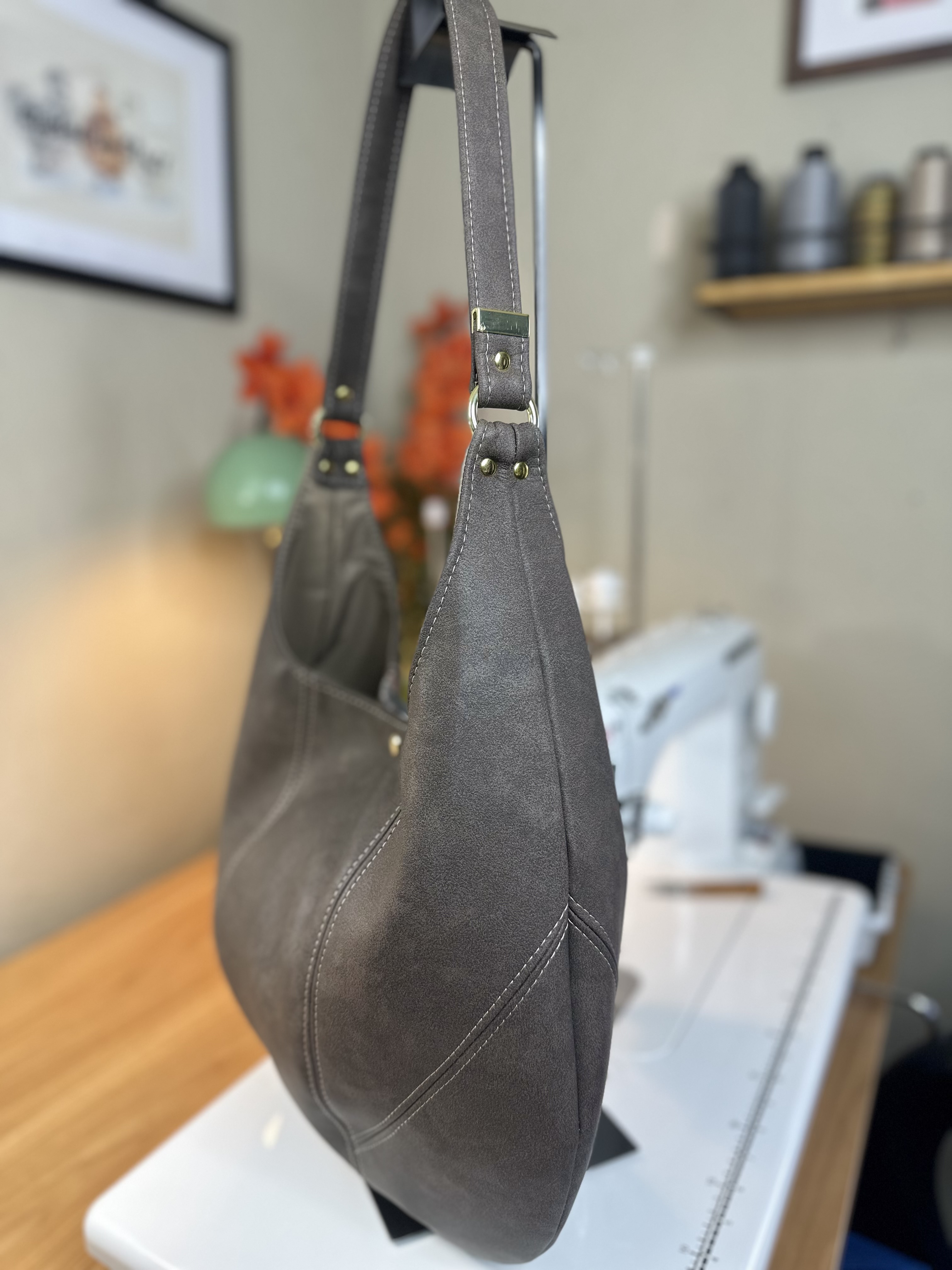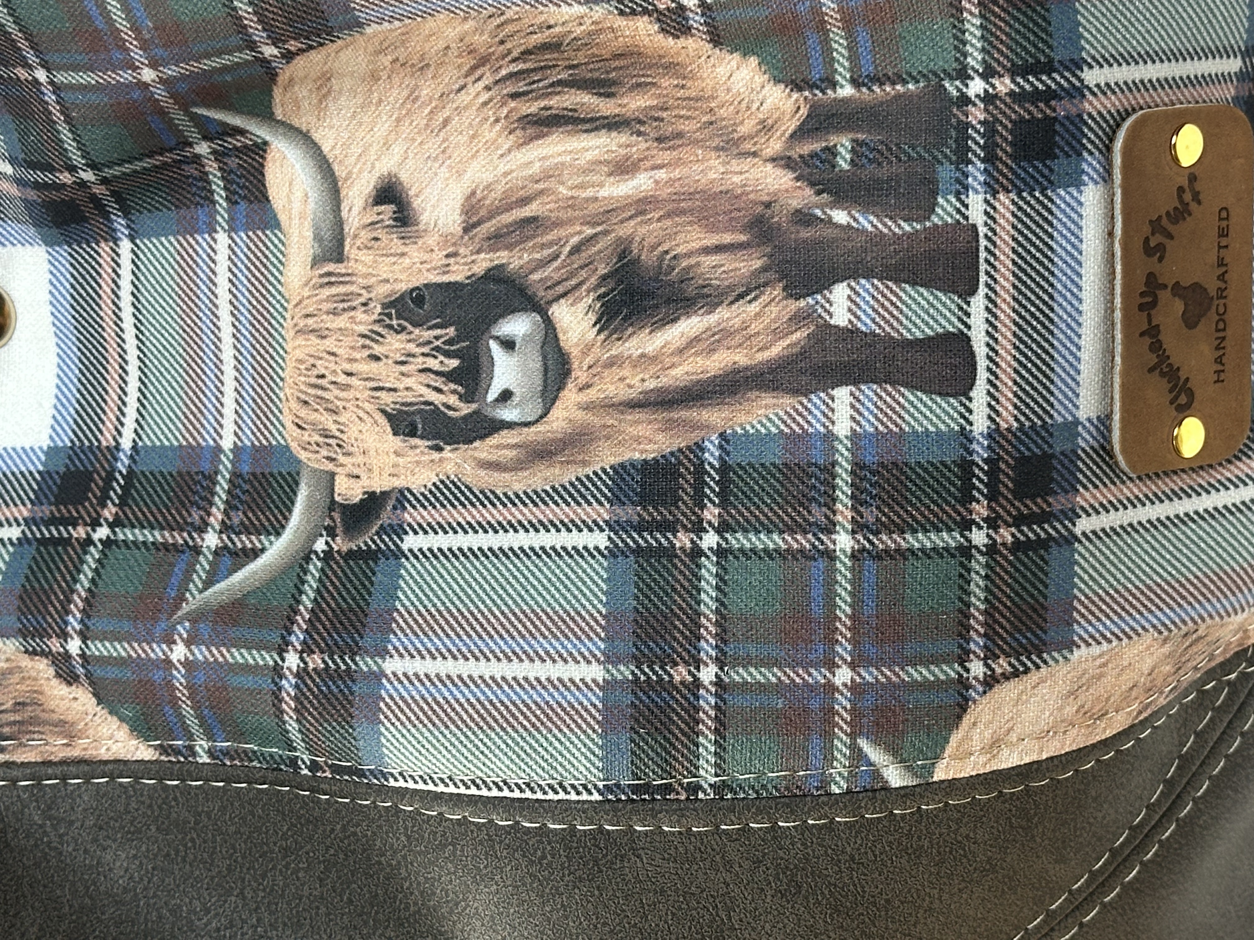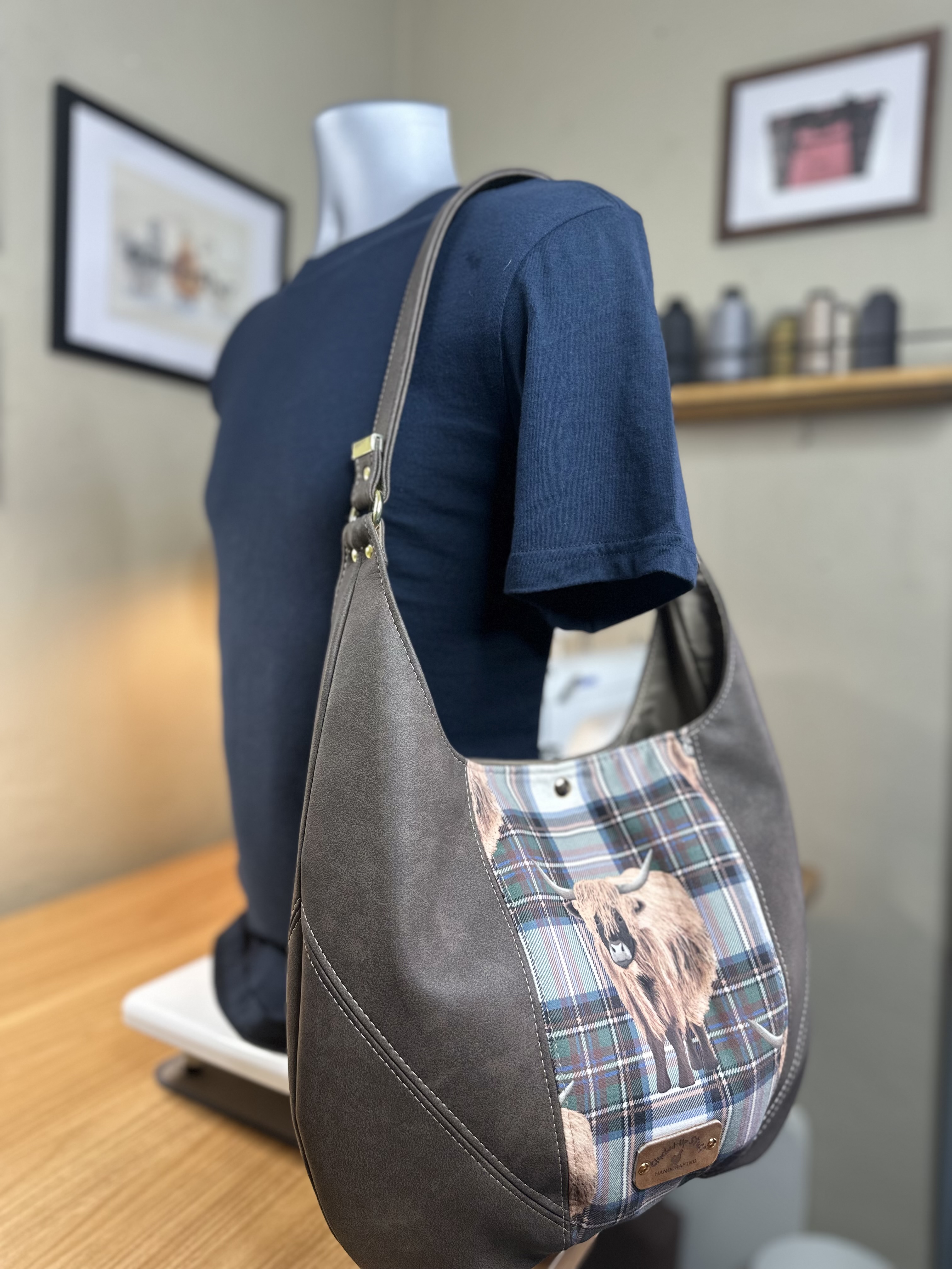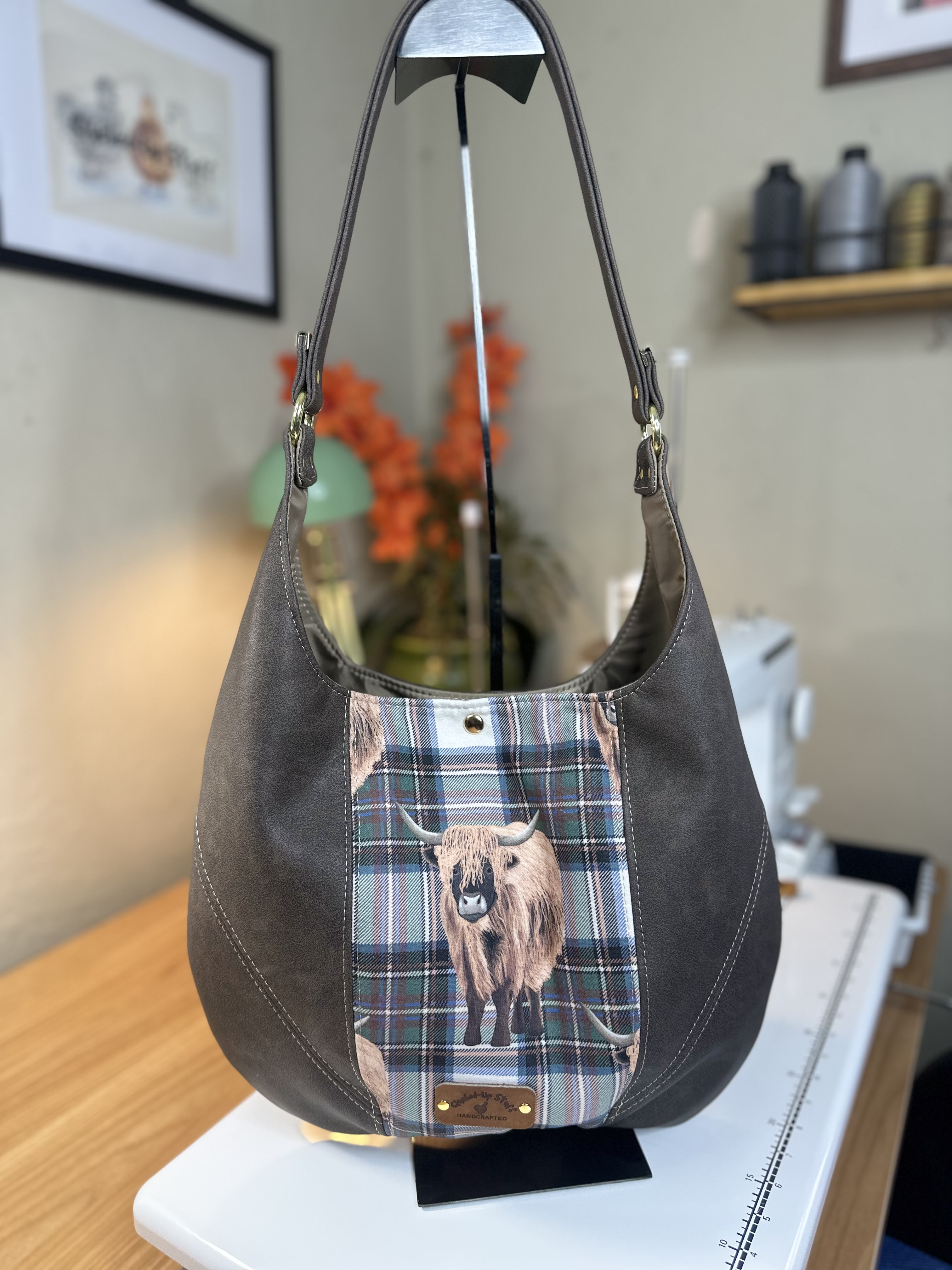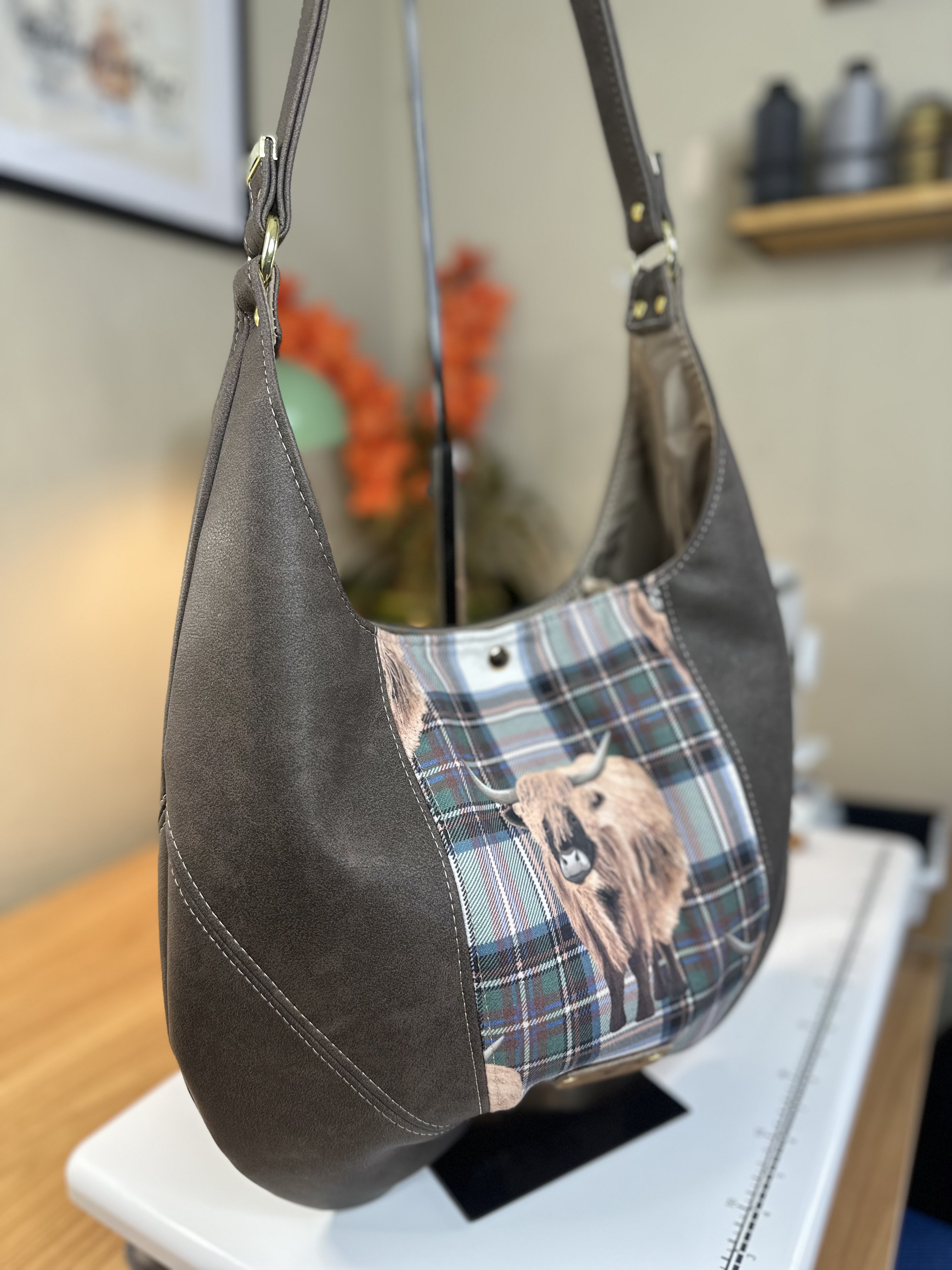 This handcrafted slouchy boho-style shoulder bag is the perfect blend of rustic charm and modern functionality. Made with buttery soft faux leather accented by an Essex linen panel featuring majestic Highland cows against a tartan backdrop, it offers a warm, earthy look with plenty of personality.